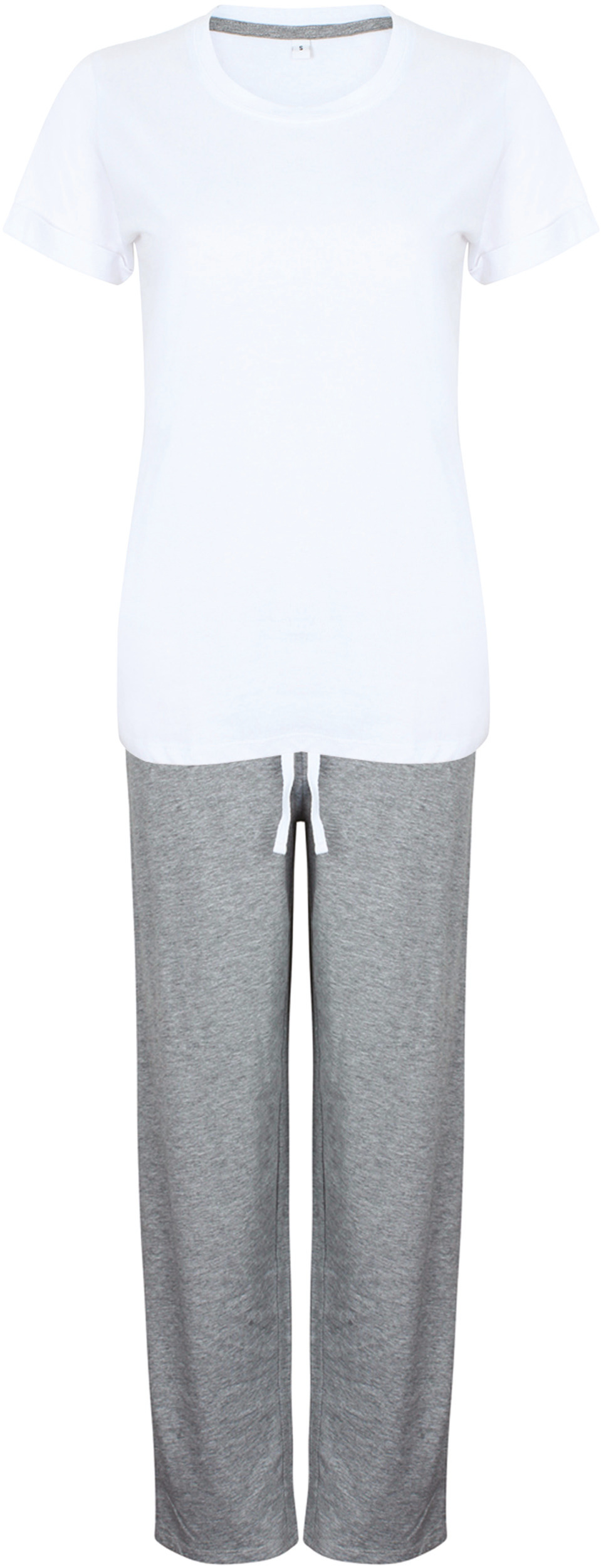 100% katoen single jersey (Heather Grey: 85% katoen / 15% viscose). Lange pyjama met t-shirt in White met oprolmouwdetail en een losse ronde nek. Lange broek in Heather Grey met een elastische taille en trekkoord en een Heather Grey zakje met koord. Zacht en aangenaam om te dragen. Fijn tricot, ideaal om te bedrukken.